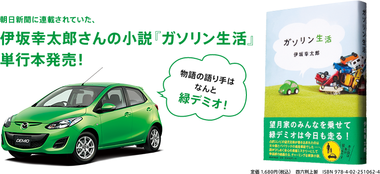 伊坂幸太郎/ガソリン生活 伊坂幸太郎さんの「ガソリン生活」を読みました!単行本の表紙。 内容は、実のところ、日々、車同士は排出ガスの届く距離で会話している。本作語り手デミオの持ち主・望月家は、母兄姉弟の四人家族(ただし一番大人なのは弟)。兄・良夫がある女性を愛車デミオに乗せた日から物語は始まる。強面の芸能記者。不倫の噂。脅迫と、いじめの影―?大小の謎に、仲良し望月ファミリーは巻き込まれて、さあ大変。凸凹コンビの望月兄弟が巻き込まれたのは元女優とパパラッチの追走事故でした―。謎がひしめく会心の長編ミステリーにして幸福感の結晶たる、チャーミングな家族小説。ちなみに、デミオって、どんな・・・・?っと探したら、こんなのあった! 感想は、いやぁ〜!もう、伊坂さん作品だな!って。作品紹介の通りに「チャーミング!」です^^!私は、伊坂さんの書く、読んでいてスパッとハマる話が大好き。読んでいて気持ちよいし、台詞のやり取りが、すげぇ好み。特に、作品に出て来る望月家の弟・亨くんが良いね。子供っぽくない子供と、大人の会話。別に大人を馬鹿にしているんではない彼の対応が、とても好きでした^^!私は車をあまり運転しないけど、私が運転する車は実際、なんて思いながら運転されてるんだろう?ってワクワクする本でした。私の車はきっと「この子、あまり運転が上手じゃないから嫌なんだよなぁ〜!」って思ってそう(笑)しっかし、車が主人公とは新しい!!(笑) PR