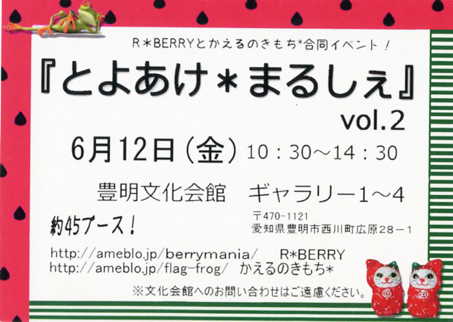 とよあけ*まるしぇ vol.02 明日はついに!「とよあけ*まるしぇ vol.02」です! 私は、平日という事で参加できませんが、作品を委託してもらいます!イラスト本や、ストラップ、缶バッチ。友人たちの可愛いイラストたちもありますので、よろしくお願いします。明細は、コチラ。友人のブログ等まりこ:ゆったりまったりまゆころ:pixiv全然関係ないけど、豊明に手芸と雑貨のお店があるらしい〜!行ってみたい。「毛糸のダッグ」----明日でついに、一週間終わりだ、だっ、だぁ!!!最近、マジで、一日終わるの早いし、なんか、無駄に疲れてるし、今週土日がクリエーターズマーケットへの追い込みではあるんだけど、キチッと休んで、疲れを取っておかなくちゃ〜!準備は出来ては居ないけど、前日に夜中までコースは回避したいです。寝不足顔で居たら、恥ずかしいのでね^^;ま、イベントが終わったら、すぐに次のイベントへ向けて準備をするんだけど、その前に個人的にご褒美するんだ〜^^!へっへっへ、何を自分に、あげようかな♪ PR
