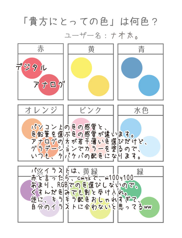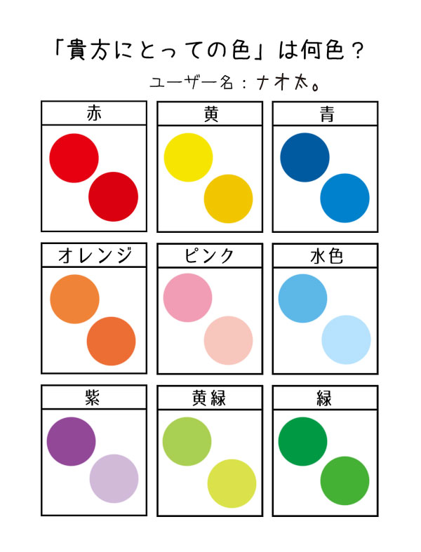 配色パレット ツイッターで流れて来て面白そうだったからやったけど、私の選ぶ色は、普通過ぎて全く面白みのない物だった〜^^; この三連休は、急遽、東京に行ってきます。節約の文字を忘れて、羽目を外してきます。朱実さんが一緒だから、心強い! PR