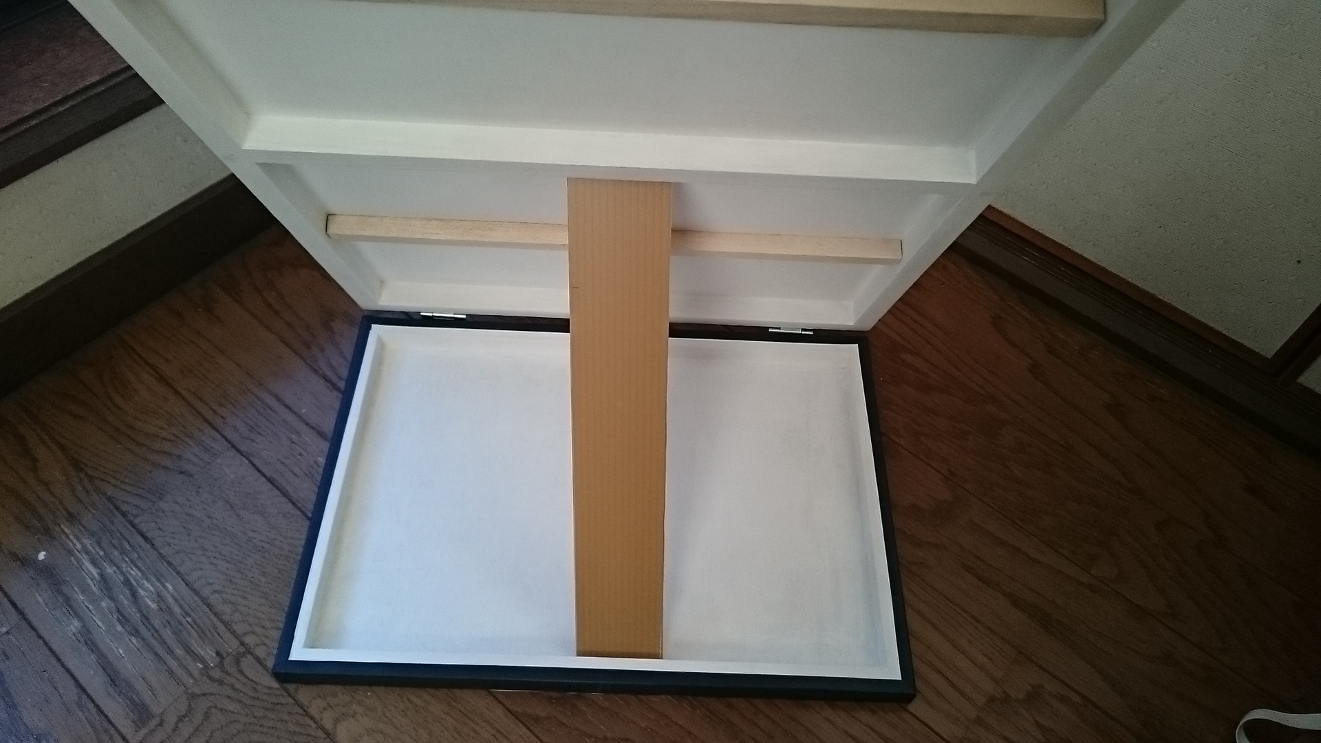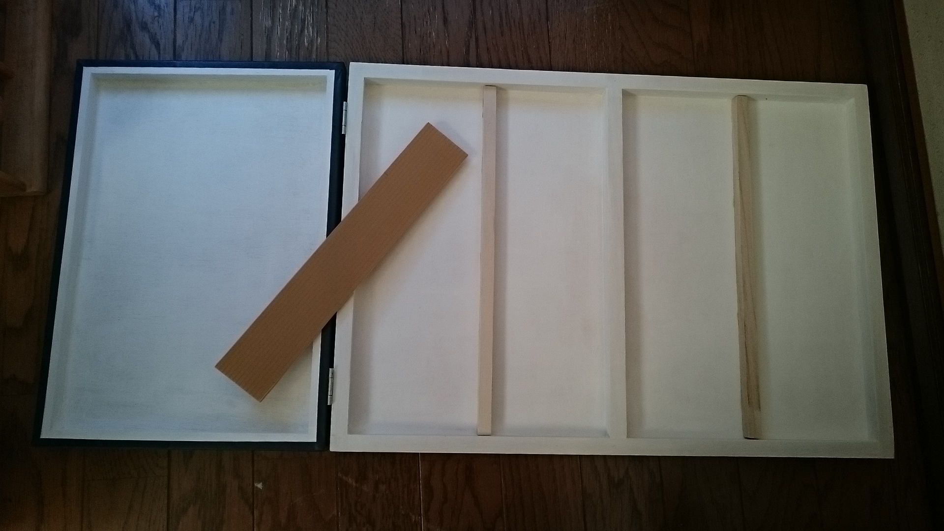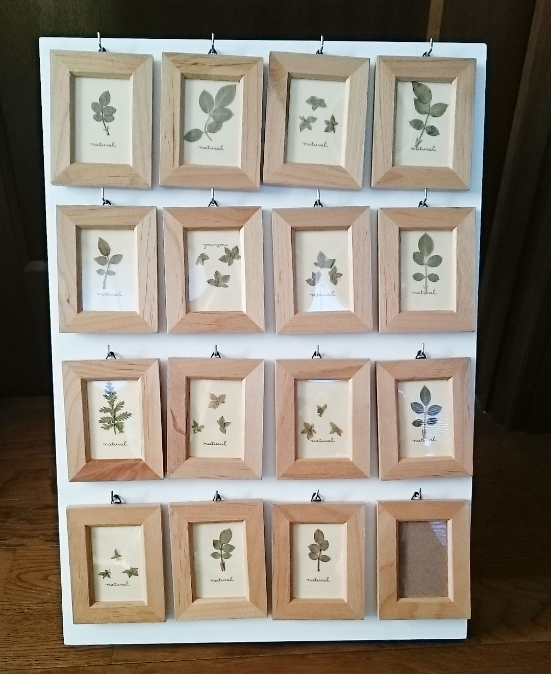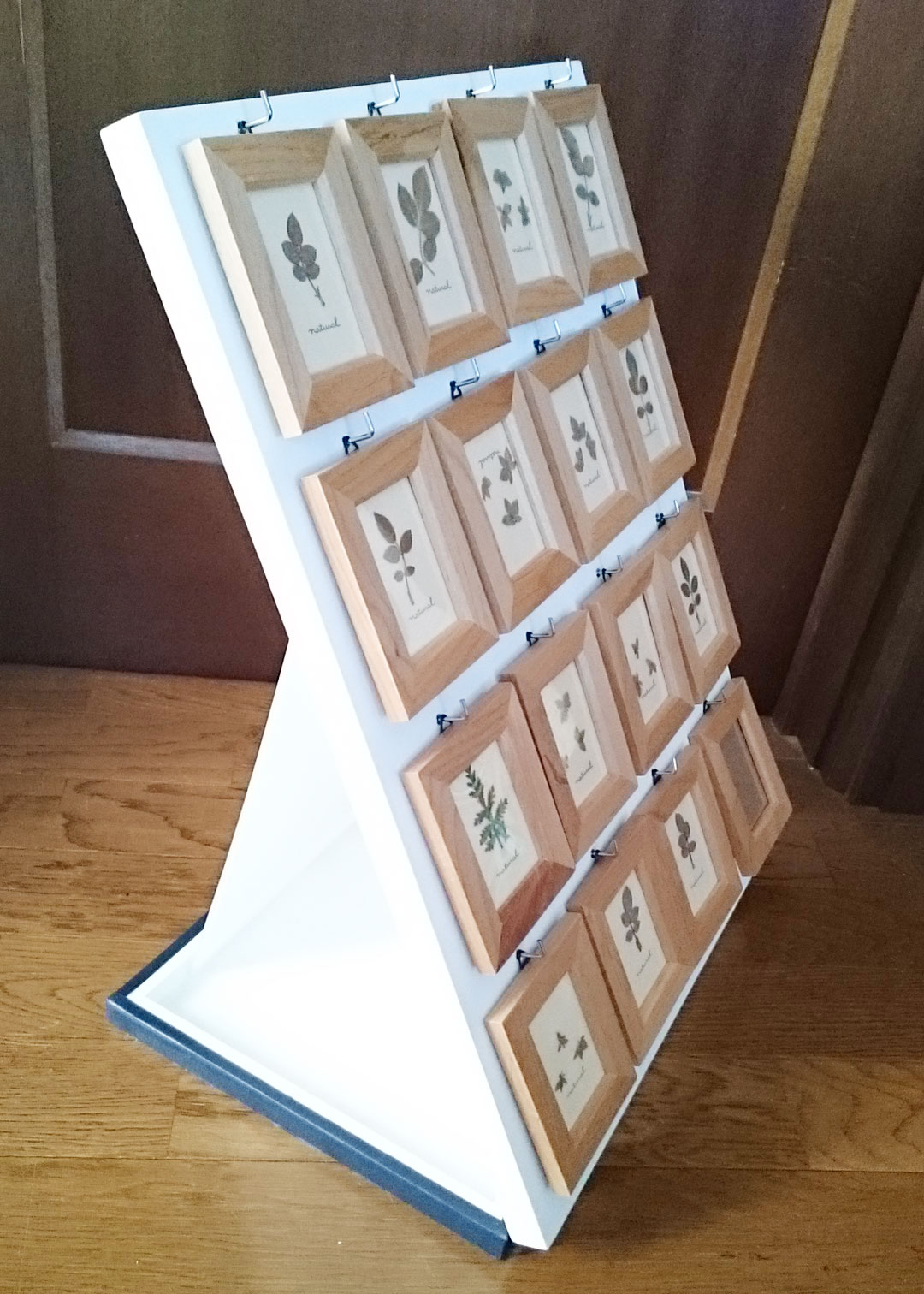 ディスプレイパネル ミニイラストを飾る用に、新しくパネルを作りました。正面から、16枚のイラストが飾れるように、L字フック付けてあります。ギュウギュウな飾り方ですが、一応、絵が栄えるように、白ベースにしてあります^^!横から見るとこんな感じ。 折りたたみで持ち運び出来るように、蝶番で繋いであります〜。 立て板(うしろに添える棒?)のサイズも、短くして、折り畳んだ時に、下板との間に収納できます。ゴムひもなどで、パカパカとしないようにくくってしまえば、立て板が何処かに行ってしまう事も無いです^^!あと、裏側のスペースに、モノが置けるので、便利です。普通に画材屋で売っている木パネルを利用しているので、受け皿みたいなカタチ(縁がある)になっているので、モノが落ちなくて良いです。(私は、名刺や、テープなどを置いてました)パネル自体もあまり高価なものじゃないので、手軽に作れます。前回作ったときは、パネルの厚みと、L字フックのネジの深さを考慮していなかったので、裏面にネジが飛び出ていて危険だったので、宛て木(?)してあります。 強度も増して、良い感じです。宛て木も、百均で、三本100円のモノを買って来た奴です。あと、蝶番も100円、L字フックも、10つ100円ぐらいのものをハンズで買いました。木パネルも、今調べてみたら、500円、300円程でした。千円ちょっとぐらいですかね。立て板は、家にあった適当な固いプラスチック板です。あとは、余っている白絵具使ったぐらい。木パネルも、普段イラストで使っている余ったものを使ったので、正直、買い足した宛て木分ぐらいしか、今回は出していません。パネル、古くて、部分的に欠けて居たりするので、再利用できて良かったです^^! PR