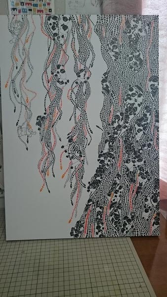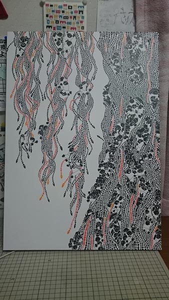 途中経過 毎日、なるべく机に向かうようにしています。体調が悪かったり、気分が乗らなかったりする日もありますが、毎日コツコツと描いて行かないと進まない、ノロノロスピードのため。イラストサイズが大きいと、尚の事です。いつも、クリマに出る際、看板用として大きい絵を持って行きたいって、思うのですが、いつも最後に慌てて描いています^^;ソレをふまえて、2月中から描き初めてみました。途中経過は、ツイッターの方でアップしたりしなかったり。本当に気まぐれですが、ポチポチ上げてました。下書きをしないで描いて行くので、自分の感覚で、このぐらいが気持ちいいって思える所まで描いて行くのですが、色を塗るとイメージや、黒のボリューム(白黒の余白の対比)が見えてくるので、徐々に増えていきます。 自分でも、どんな絵になるかは、描き始めは漠然としたモノしか考えてません。終着点が、良いなってなるように描いて行くだけです。今回のこの絵は、1月に見た歩く木こと、「ガジュマル」をモチーフに描いてみました。ガジュマルは、最初に生えた所から、時間をかけて移動して行きます。一本の木、枝から、ツタが降り、ツタが新たな根っこに、そして、幹になって、行くらしいです。木は、どんどんと、上に成長して行くだけなんだと思っていたので、それを知った時はスゴいなぁっと、思って、絵にしてみたくって。何本ものツタが絡み合ったような木で、それぞれが支え合うようなイメージだったので、三角を沢山繋げて絡ませて描いてみました。生命力が、新しく伸びて行くツタに多く見えるように少しオレンジを左が多めにしてみてます。何処まで伝わるか分からないし、そもそも、木を描いていると、分かってもらえるか分からない(たぶん、木には見えないだろうな)けど、絵が描き上がって、私は美しいなっと、自画自賛したので、ソレが伝わると良いなぁ。絶対ですが、私は、数年、いや、数ヶ月後に自分の絵を見て、これが「木をモチーフにしたイラスト」だとは、わからないでしょう。 PR