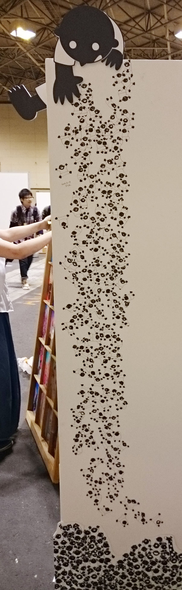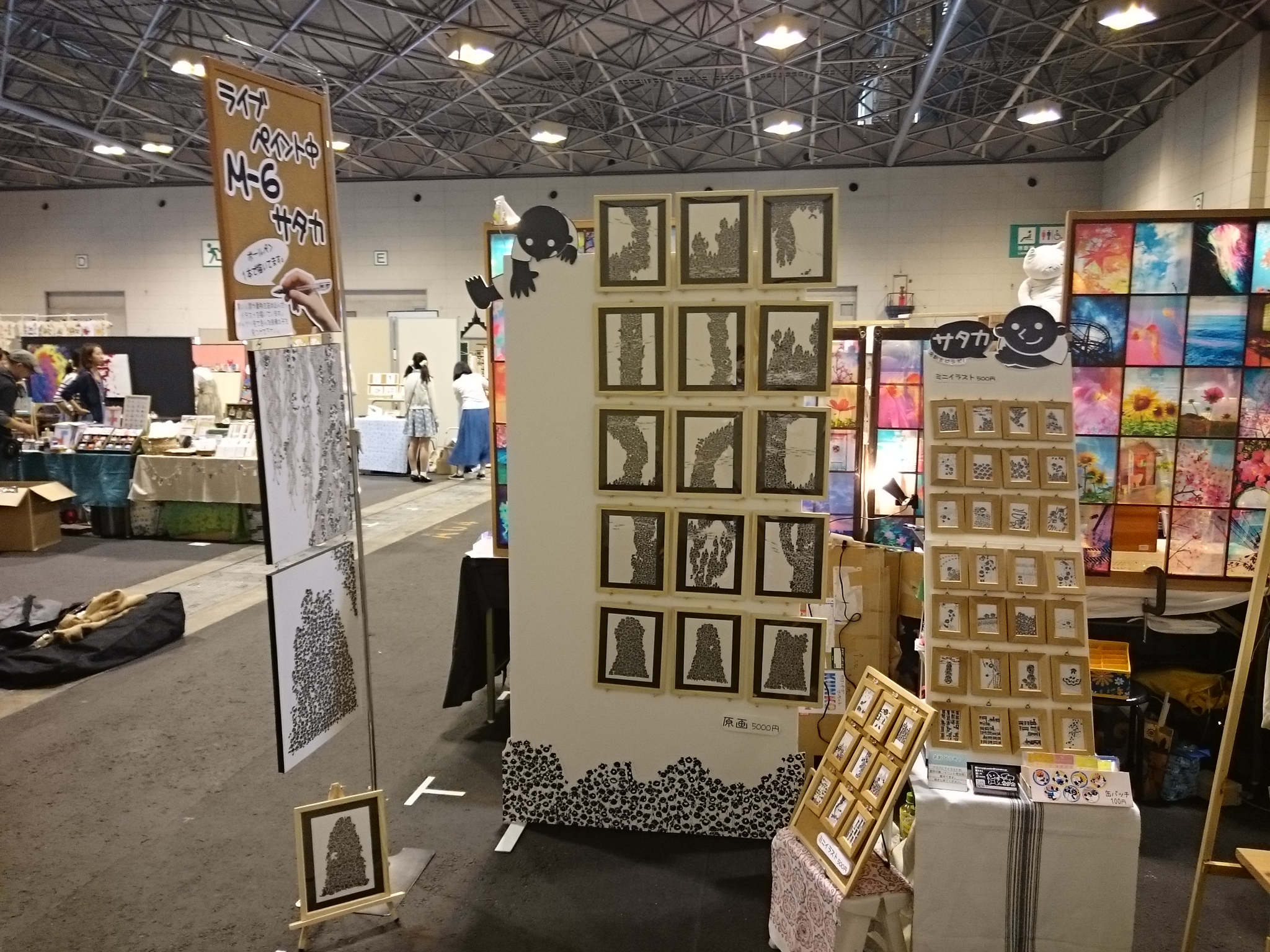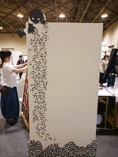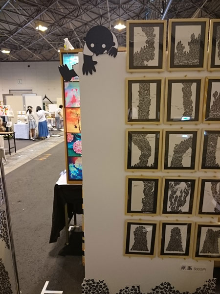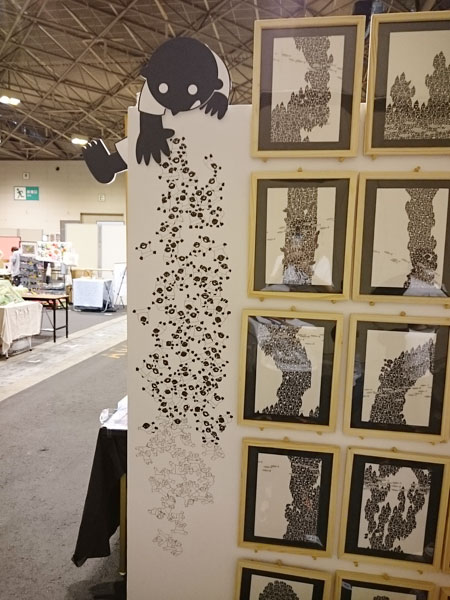 ライブペイント クリエーターズマーケットでは、前回同様、ライブペイントをしました。前回の作品は、コチラでチェックして下さい^^! → 12月のライブペイント作品今回のスペース配置はこんな感じ。前回とあまり変わってませんが、今回は、角の配置だったことで、看板について、モチャモチャやりました。そちらはまた後日^^! 描く前の白紙は、コチラ。 まずは、全体と、バランスの確認。あとはひたすら描くのみ!!今回は、人間さんたちを、あまり密着しすぎずゆとりを持った繋がりで、描いて行きました。前回の時の作品を見てもらえると分かるのですが、密着し過ぎであまり立てに長くかけなかったので・・・。「今回は、とことん長く!!下まで描く!!」を目標に。途中経過をあまり写真に撮っていません^^;;撮り忘れです;; 二日目のスタート時の経過写真です。一日目になかなか気張ったので、割と進んで見えますが、色塗り作業と、下の方は体勢がキツく、何度も立ったりしていたので、二日目の負担を考えると、一日目にもう少し頑張れたら、翌日が楽かな・・・っと考えつつ。前回は、二日目終了のギリギリまで粘って描いていました。今回は、二日目の15時には仕上げることが出来ました。が!!描き上げてしまうと、印刷に見えるらしく(描いていてもアナログと見えないと、前から言われていたのですが・・・)、描き上げてしまったら、なかなか取っ掛かり(インパクト)が少なくなるみたいで、足を止めてもらえなく^^;やはり、描いてるって、パフォーマンス、なんですねぇ〜。ライブペイントブースでやっている方も、描き上がったあとは、どうするんでしょうかね。気になります。コレは、今後の課題ですね。私のイラストは、ムラなくキレイに塗っている(と、自分では思っています)。キレイに塗れているのが、平坦で綺麗って、感じているので、ソコがこだわりの部分でもあるのですが、折角のアナログイラストが、アナログに見えないって、コレ如何に><!うーん、悩みます;;あと、個人的に、「撮影OK」の、はり紙をしようかなぁ〜っと、次回へ持ち越しの提案をしつつ。完成はコチラ!クリックで大きく見れます。描いていると、とても沢山の人に、「本当にペンで描いてるの?」や、驚きや褒めてもらえる言葉を沢山いただきました!本当にありがとうございます。この記事の途中に描いたように、私がライブペイントする問題点もありますが、とても貴重な体験です。過去何回か、クリマでライブペイントをしていますが、コレからも、挑戦して行きたいと思います!ちなみに、今回は、「203人の人間を描きました」!(多分)またイベントで見かけた時は、よろしくお願いします〜〜〜!イラストを取り外しての全体は、少し寂しいです〜 PR