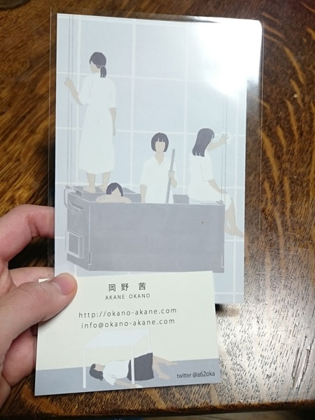 クリマ戦利品02 クリマの戦利品紹介ふたつめ〜!岡野 茜さんのポストカード。 ささ〜っと、スペースを歩いている時に、素敵な作品を飾っていたので、立ち止まってしまいました。予備知識なしに、イラストに痺れました。残念ながら一番痺れたイラストのポストカードがなかったので、次に痺れた奴です。一番良いと思ったのは、群衆(?)の上になぞの物体が浮いているものでした。少々、友達に送るのは悩むデザイン、画風ですが、グレイが買った世界と、顔のない人間。とても、面白いなぁっと、思い、手に取りました。ゲームの、サイレントヒルとか好きだと、好きな感じかなって思いました(個人的な意見です)。千葉在住ということで、次回もお会いしたいイラストです。もっと見てみたいなぁ〜〜!!!▼ 岡野 茜さんのHP▼ 岡野 茜さんのツイッター PR