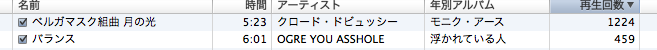 再生数 何気なく、音楽プレイヤーの再生回数を見てみたら、1位と2位が段違いでした。 こんなにも1位の曲を聞き込んでいるとは、自分でもビックリでした。しっかし、2位に入って来た曲が、まさかコレだとは思いませんでした。OGRE YOU ASSHOLEって、アルバム「浮かれている人」しか持ってないんですよね。バランスって曲のPVを見て、なんだこの曲は!っと、すぐにCDを買いました。その後、ハマるだろうなぁっと思ったのですが、次のCDを買うまでに動きませんでした。まぁ、ココ何年かは、お財布の口がキツいというか、どの分野にお金を使うか限られた選択をしているので、CDを買う優先順位が低いんですよねぇ。うーん、新しい音楽も開拓したいなぁ〜〜! PR
